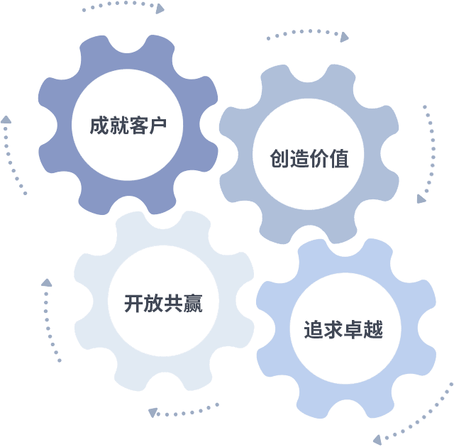 成就客户是一切决策的出发点,,,,创造价值是衡量所有工作的标准,,,追求卓越是我们做事做人的态度,,,,开放共赢是我们的格局也是最终的结果。。。。价值观的齿轮环环相扣,,,推动着组织里的每个人不断向前。。。